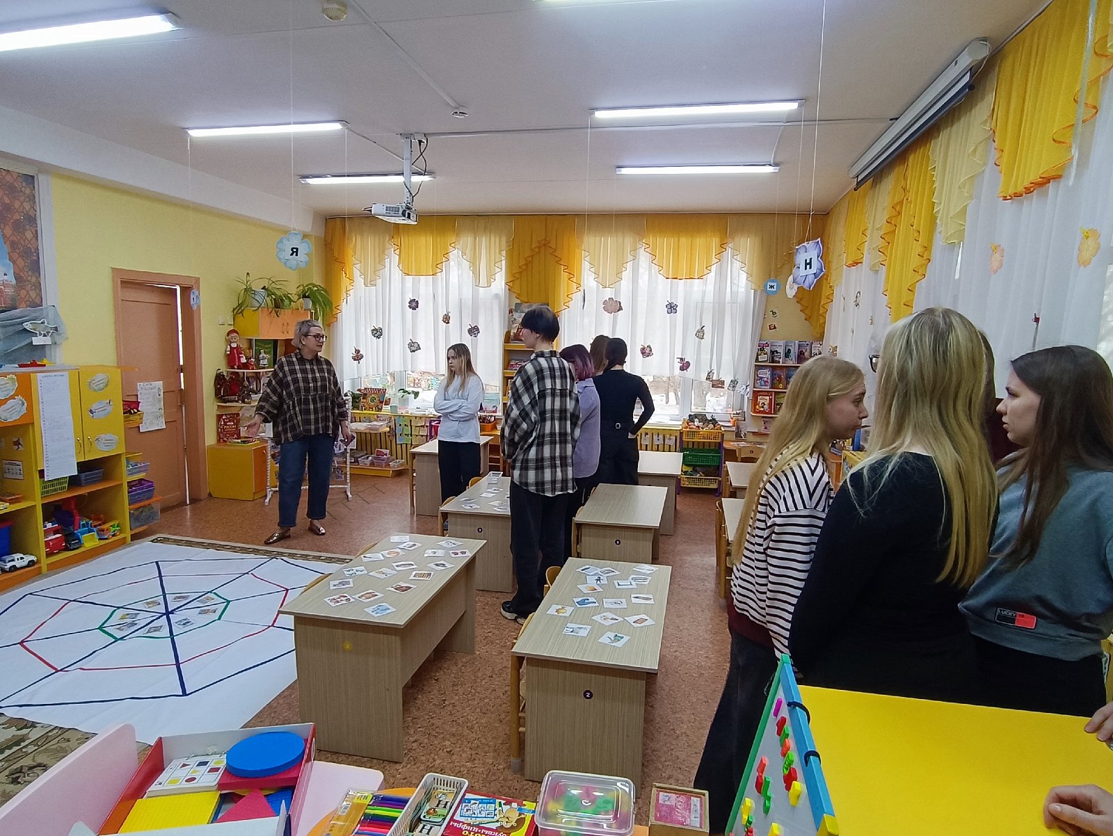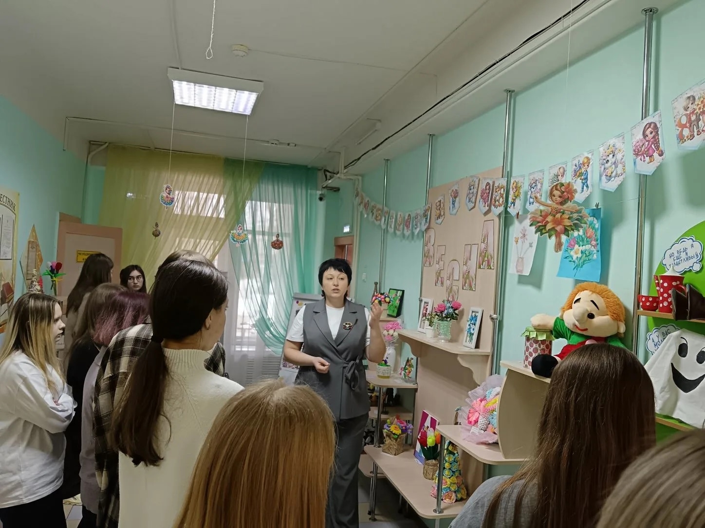 Воспитатель Светлана Николаевна организовала экскурсию по группе "Смешарики" и провела для студентов игру "Путешествие по сказкам К. И. Чуковского".